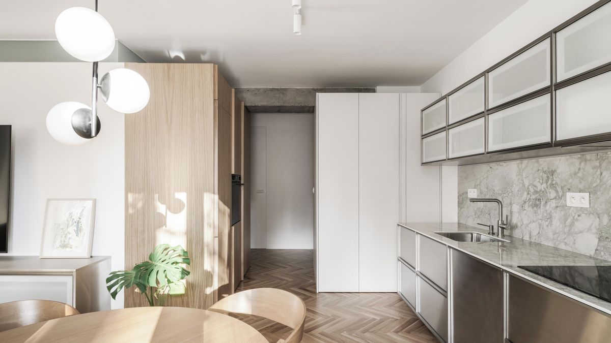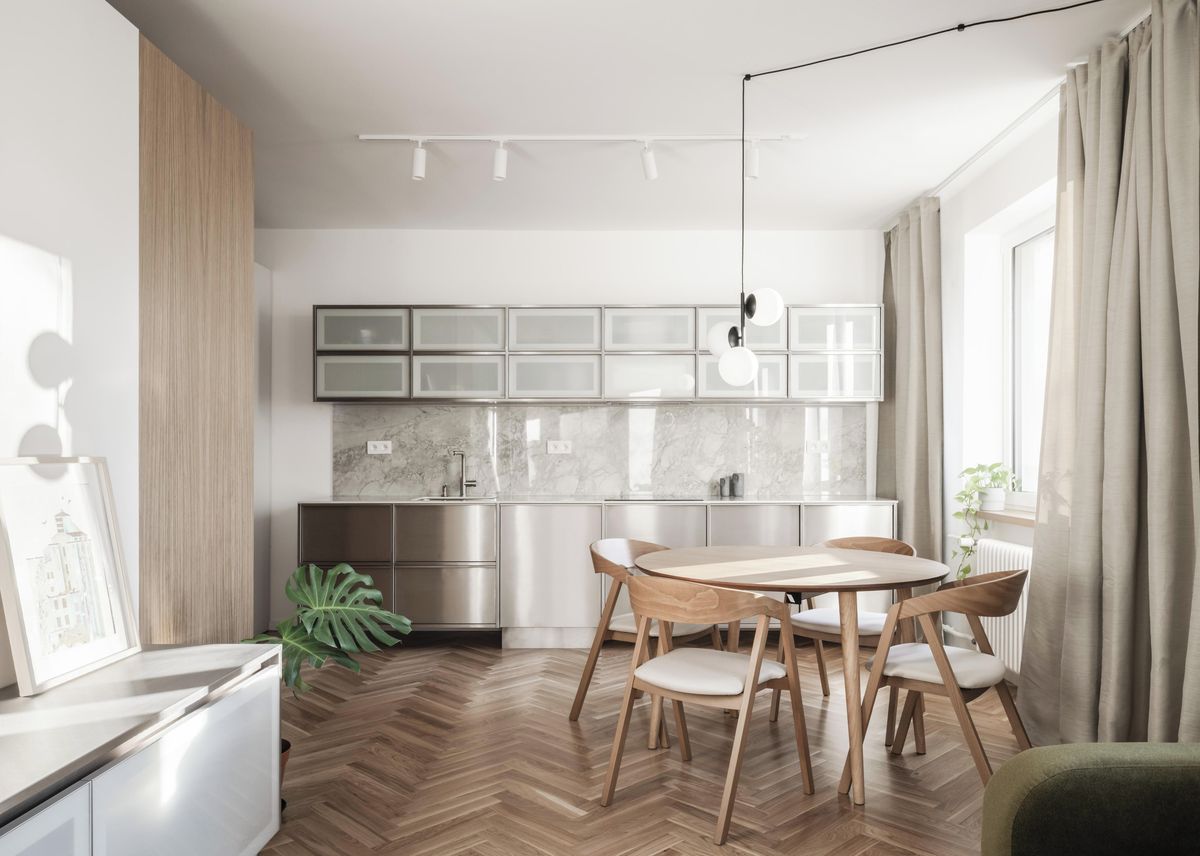 Ten vznikl odstraněním příček. „Srdcem bytu jsou nyní jeho denní zóny, které jsou navíc prosvětlené. Opticky zvětšují plochu bytu a vytvářejí místo, kde mohou obyvatelé bytu společně trávit čas,“ říká architekt Marek Abramovič z ateliéru abrama architekti.