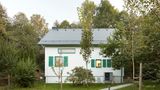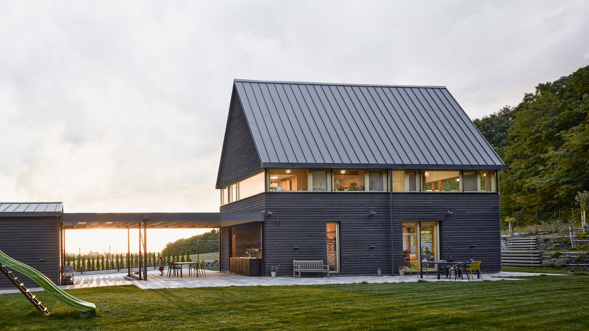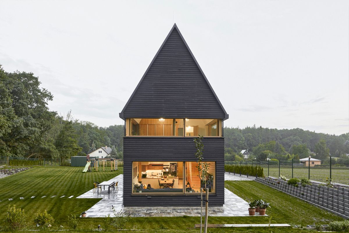 Vlastní dům má výraznou vertikální orientaci, takže ji architekti zjemňují linií vytvořenou jak horizontální orientací dřevěných obkladů, tak navazující stodolou a zastřešením, které obě budovy propojuje.