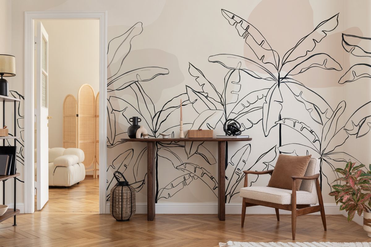 Ve světlejších a prostornějších interiérech si můžete dovolit i tmavší motiv palem, třeba v kombinaci se západem slunce. Zároveň v nich můžete zvolit větší vzor palem, který by jinak v menších a stísněnějších prostorách místnosti opticky ubíral na velikosti.