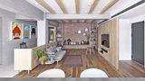 Jídelně dominuje velký masivní stůl, který doplňuje dlouhá sedací lavice a nápadité závěsné svítidlo. Barevnost je jednoduchá – převládají béžové a šedé tóny, dřevo a jemné zlaté akcenty. V ložnicích pak tuto klidnou skladbu oživují modré skříně a police.