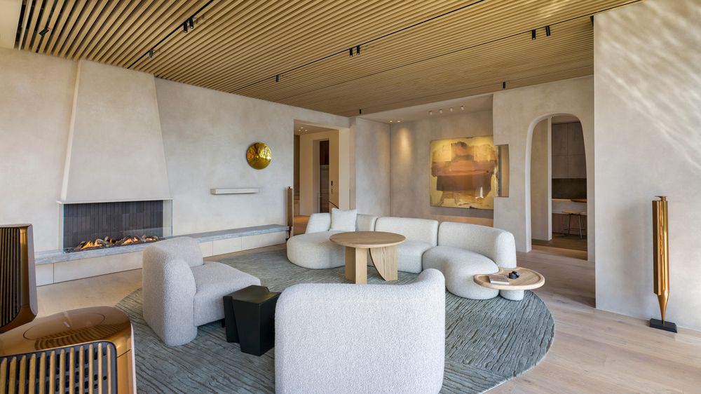 V obývacím pokoji najdeme akustický dřevěný podhled, stylový krb a oválnou sedačku, která znovu potvrzuje, že oblé tvary tady nejsou jen tak náhodou, ale že jde o hlavní vizuální motiv celého domu.
