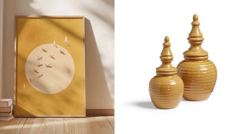 Doplňky v okrové vnesou do interiéru teplé akcenty.