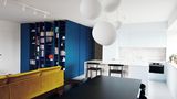 Barevnost zeleného jádra doplňují modré vestavěné prvky pracovny a knihovny – zónují interiér a dodávají mu svěží charakter. Transparentní příčky zároveň vytvářejí pracovní kout, zatímco bílé vestavné skříně poskytují dostatek úložného prostoru a ukrývají i druhou šatnu. Třetí důležitou barvu bytu, růžovou, vyhradily architektky pro intimní prostor, tedy pro koupelnu.