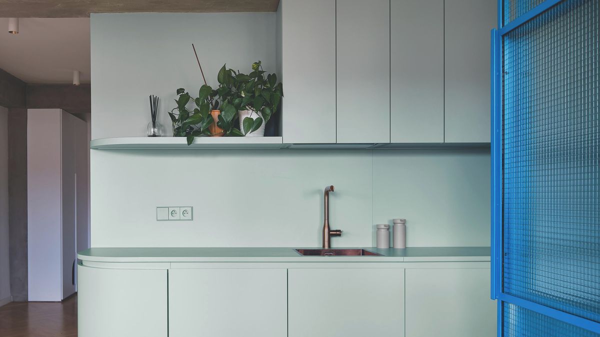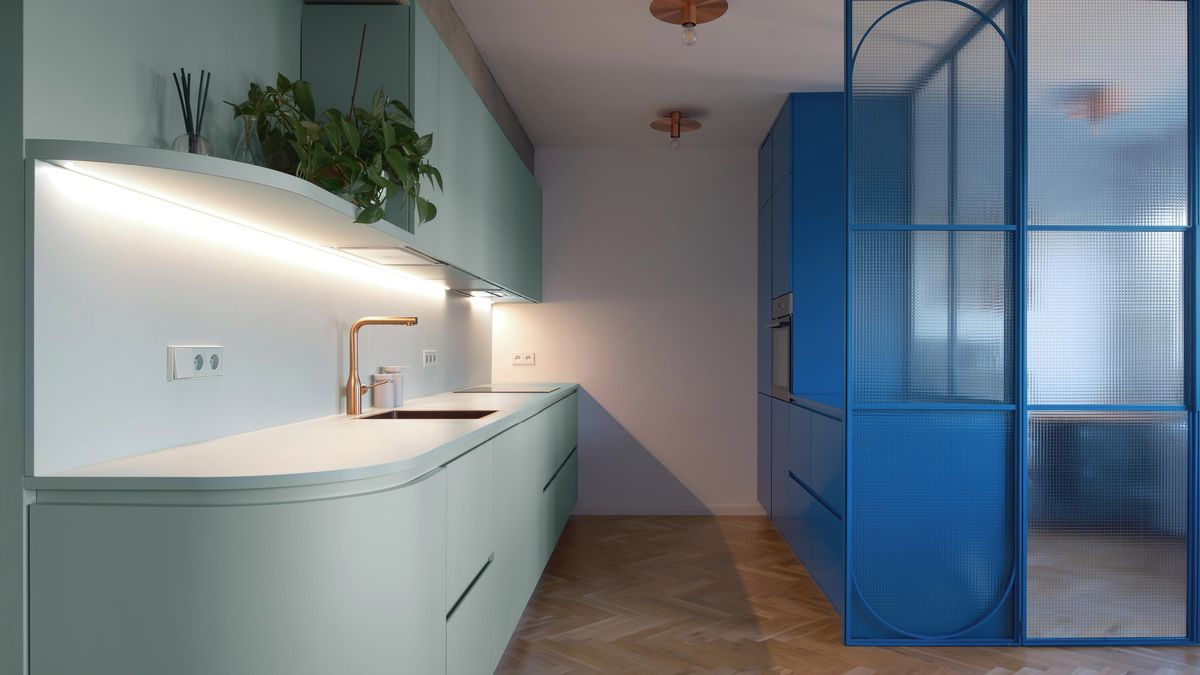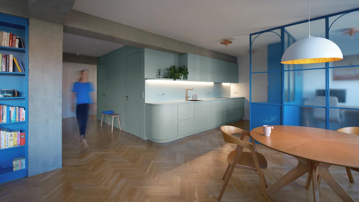 Byt v domě z 50. let v pražských Holešovicích prošel kompletní rekonstrukcí, která proměnila původně stísněnou dispozici v otevřený prostor pro mladou rodinu. Zelená centrální vestavba se šatnou a hygienickým zázemím určuje rytmus života v bytě, modré akcenty dodávají interiéru svěžest a růžová je vyhrazena pro intimní prostory. Atmosféru dotvářejí dubové podlahy, cementové stěrky a měděné detaily.