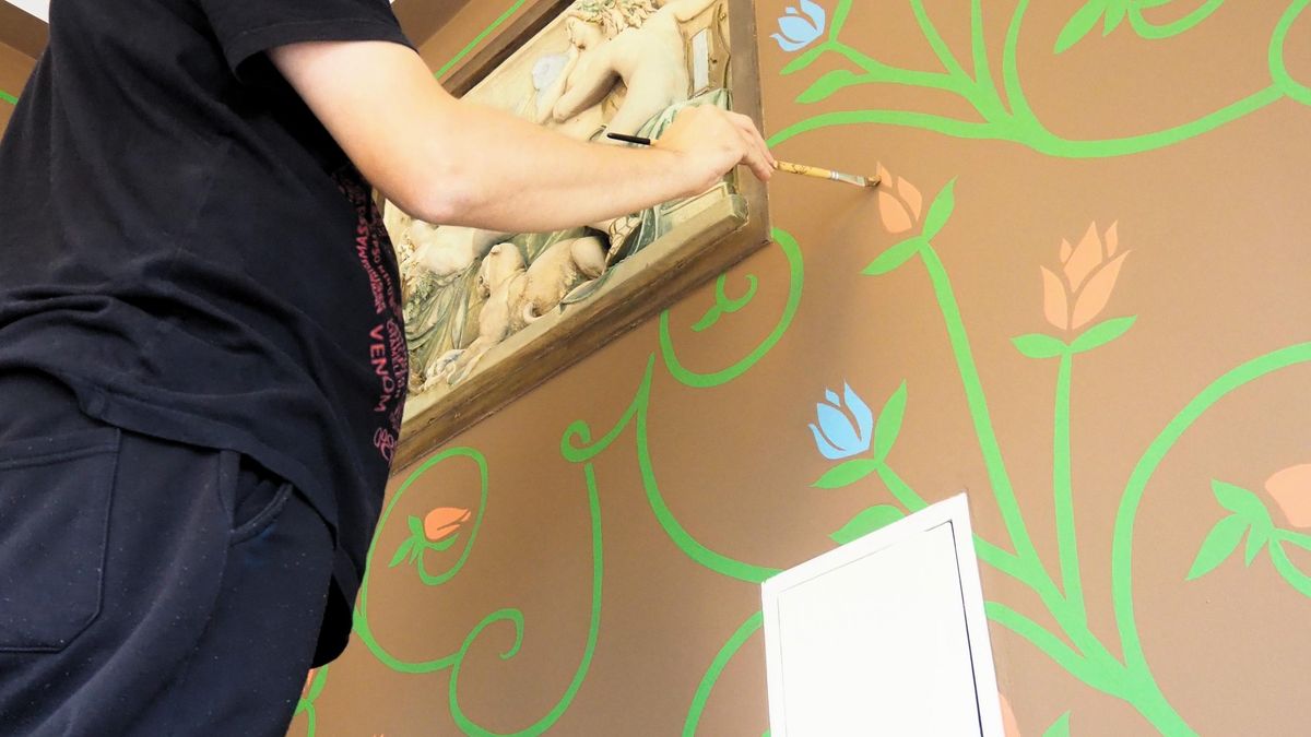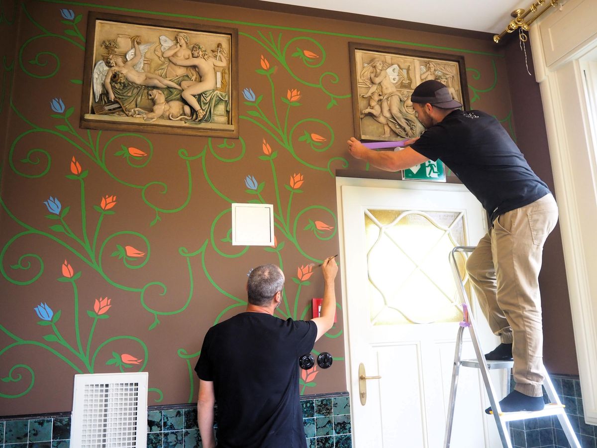 Ve vile zatím malovali čtyři místnosti, další práce je zde ještě čeká v následujících měsících. „V ložnici paní Grossmannové jsme malovali ornamenty kolem rámu postele, na toaletě jsme dělali ty detailní proužky podle původní tapety. V alkovně jsme vytvořili obrysy stěny ze zelených pruhů a v zimní zahradě květinové ornamenty,“ ukazoval další z umělců Oto Vehovský, který nedávno v ostravské Hrabové dokončil malbu zvířat na šestadvacet garáží.