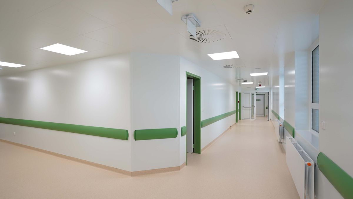 Nás zaujala vlastní výroba modulů. Ty totiž vznikaly ve výrobní hale (trvalo to také tři měsíce) a jsou ušity nemocnici na míru. Doslova. Na začátku vznikl jeden lůžkový pokoj včetně bezbariérové koupelny. Z nemocnice si do něj dovezli invalidní vozík i lůžko a vyzkoušeli si manipulaci s pacientem. Podle zpětné vazby lékařů a nemocničního personálu pak výrobce upravil například šířky dveří. Hotové moduly pak na místo dorazily už včetně příček, podlah, stropů, kompletního vybavení koupelny a rozvodů.