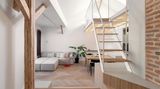 Díky tomu jeho nástupní rameno dostali přímo do obývacího pokoje a pod schodištěm mohli vytvořit uzavřený úložný prostor, na který navazuje mini pracovna. Pracovní koutek, který je schovaný za skládacími dveřmi, je možné úplně uzavřít, nebo naopak otevřít do chodby. Druhé pracovní místo vzniklo jako součást odlehčené knihovny, dominanty celého obytného prostoru.