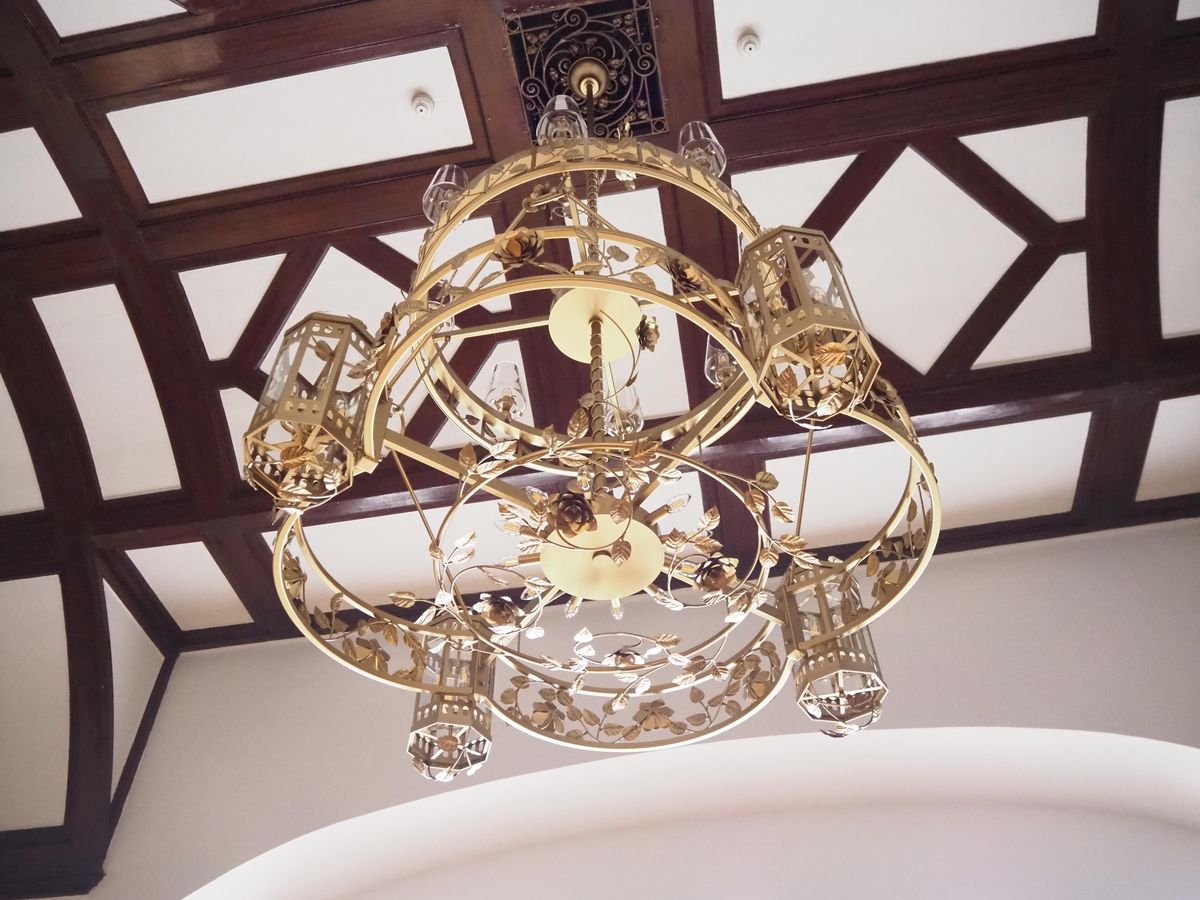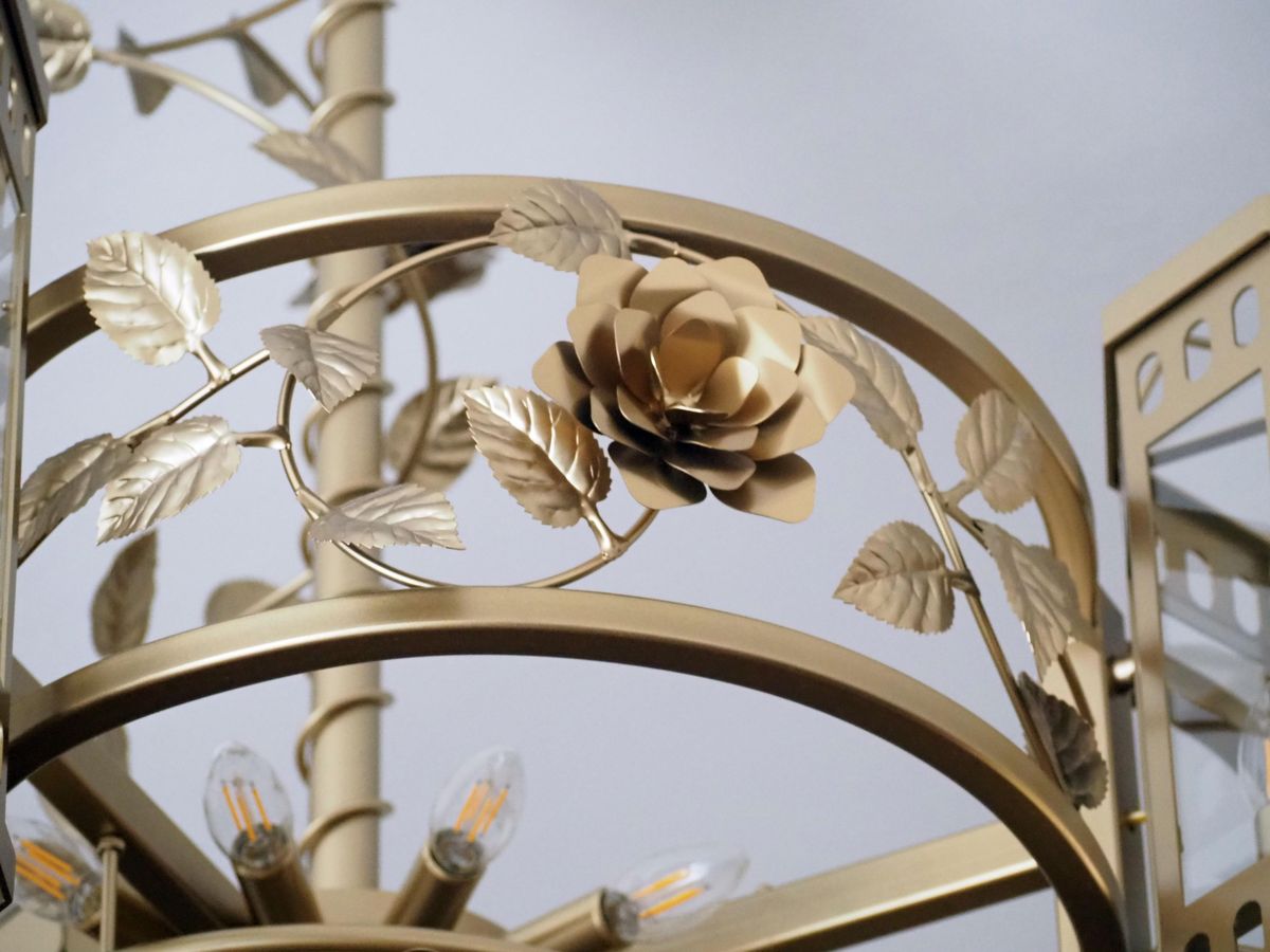 Detail jednoho z unikátních lustrů s růžemi a lístky.