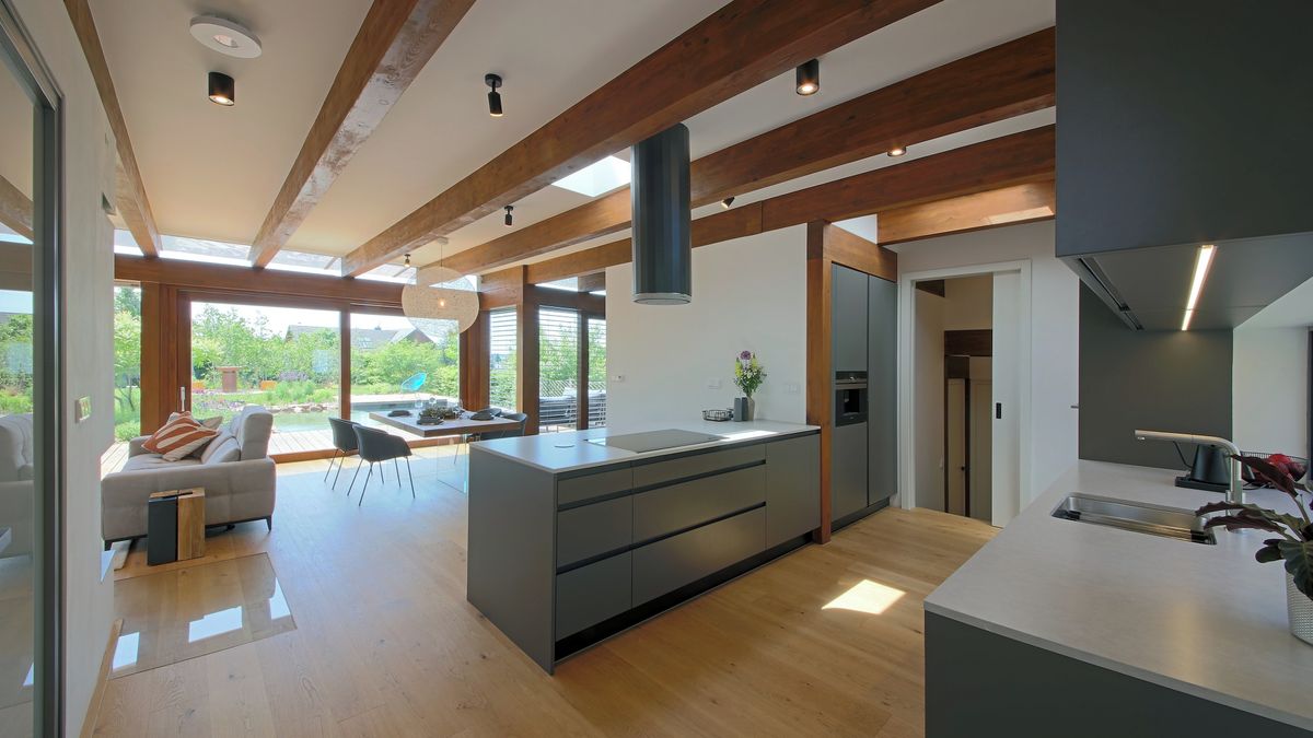 Také stěny v interiéru jsou omítnuté, podlahu tvoří v obytných místnostech dubové lepené lamely. Koupelny, předsíň a technická místnost jsou vydlážděny velkoformátovou keramickou dlažbou.