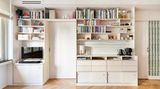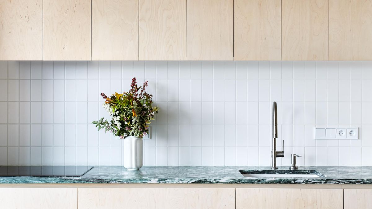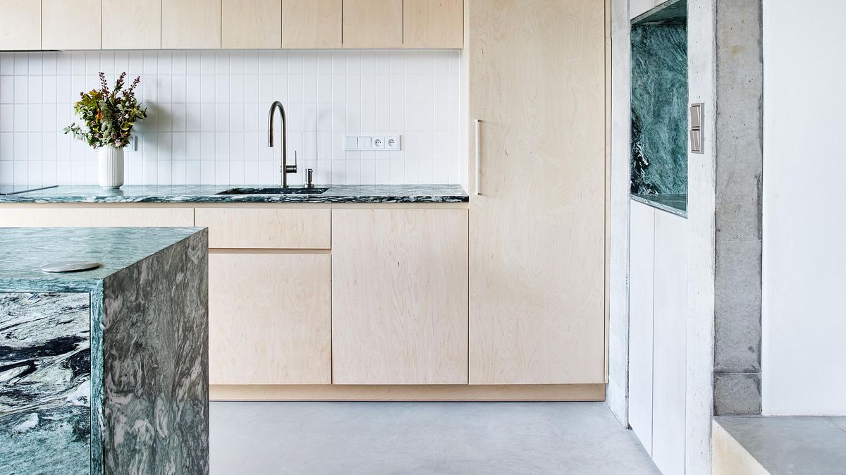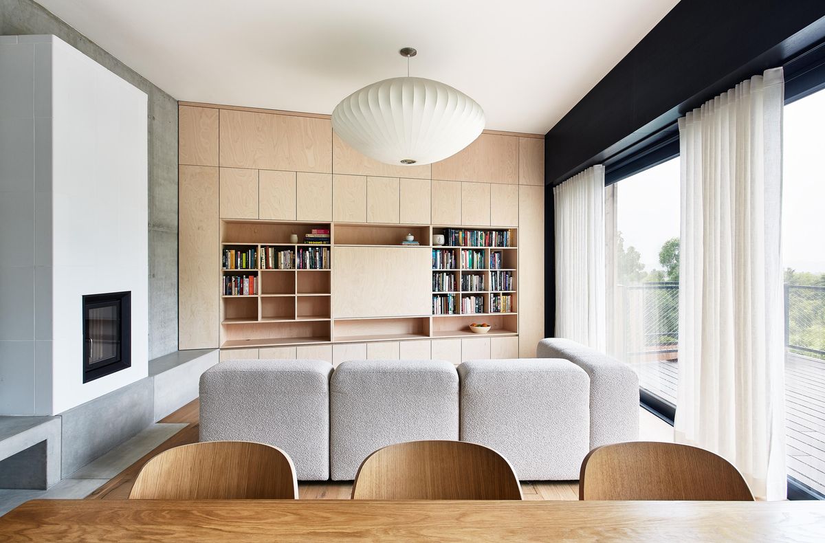 Kuchyňská sestava i knihovna jsou naopak zhotoveny z vizuálně klidnější březové překližky, která nechává vyniknout dominantnímu kamennému prvku. Bílé obklady v zázemí kuchyně i na krbu pak fungují pouze jako tichý, neutrální doplněk, jenž podporuje celkovou harmonii interiéru, aniž by na sebe strhával pozornost.