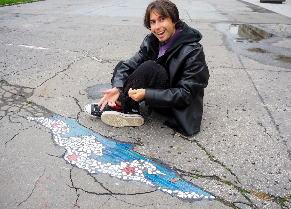 Matěj si místa na mozaiky pečlivě vybírá, obchází lokality a hledá. „Dělám to zatím jen pár měsíců, vše testuji, rozvíjím se. Zajímám se o dané místo, co tam lidi dělají. Motivy mám abstraktní, ale postupně už do nich vkládám i odkazy na města. Vyzkoušel jsem si i materiály,“ ukazoval výtvarník.