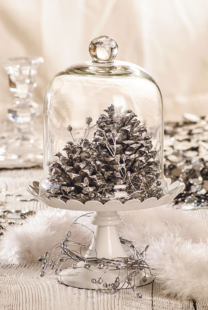 Šišky borovic pod skleněným poklopem vyniknou svými detaily a získají i slavnostní nádech.