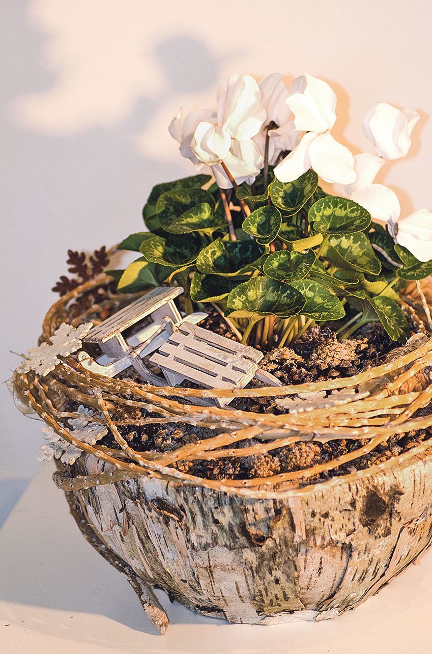 Bělostné květy bramboříků vyzařují svěžest a k sezoně ledu a sněhu se hodí. Květináč vložte do obalové nádoby a povrch substrátu zakryjte vrstvou šištiček modřínu kratších než palec u nohy. Stočte modřínové haluzky do volného věnce a usaďte ho lehce přes okraje nádoby, vznikne tak iluze útulného hnízda.