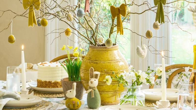 Ve velikonočním interiéru by neměla chybět závěsná dekorativní vajíčka, stejně jako velikonoční věnce. Ty mohou být klidně z plsti nebo umělých či pravých větviček vrby jívy či jen z obyčejných větviček, a připomínat tak hnízda ptáků.