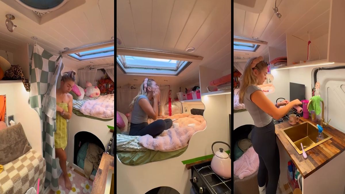 Interiér její „dívčí dodávky“ působí jako stylový miniapartmán. Růžovo-bílý design, oddělený prostor na spaní a obývací část, trouba, sprcha i chytře vymyšlená úložná řešení. Nechybí ani střešní okno a solární panely, díky nimž je částečně energeticky soběstačná.