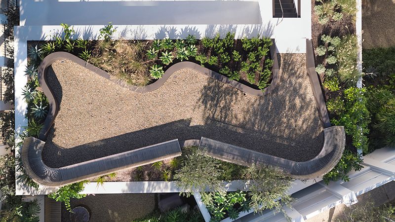 Jedním z nejvýraznějších prvků domu je bezesporu podzemní bazén. Jeho nezvyklé umístění jej dělá tajemným, až mystickým místem. Návrh čerpal inspiraci z povahy místa – celá přístavba byla totiž vyhloubena do pískovce, typického pro severní pobřeží Sydney. Na své působivosti ale bazén získává díky parabolickým obloukům, které jsou nejen architektonicky výrazné, ale díky svému tvaru dokážou nést zatížení několika úrovní nad ním. A přirozené světlo? To se sem dostává světlíky vyříznutými do podlahy, umístěnými o dvě patra nad úrovní bazénu.