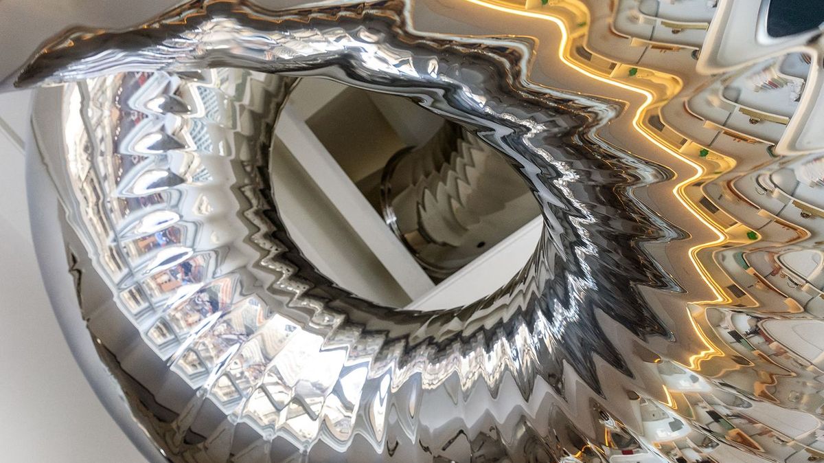 Tobogán se vine interiérem bytu jako lesklý had a propojuje jednotlivá podlaží způsobem, který je všechno, jen ne obyčejný. Místo klasického přesunu po schodech nebo výtahem stačí nasednout a během pár vteřin jste o patro níž. A ne, není to žádná plastová skluzavka z hračkářství. Jeho zrcadlový povrch dodává celému prostoru futuristický, téměř surrealistický nádech.