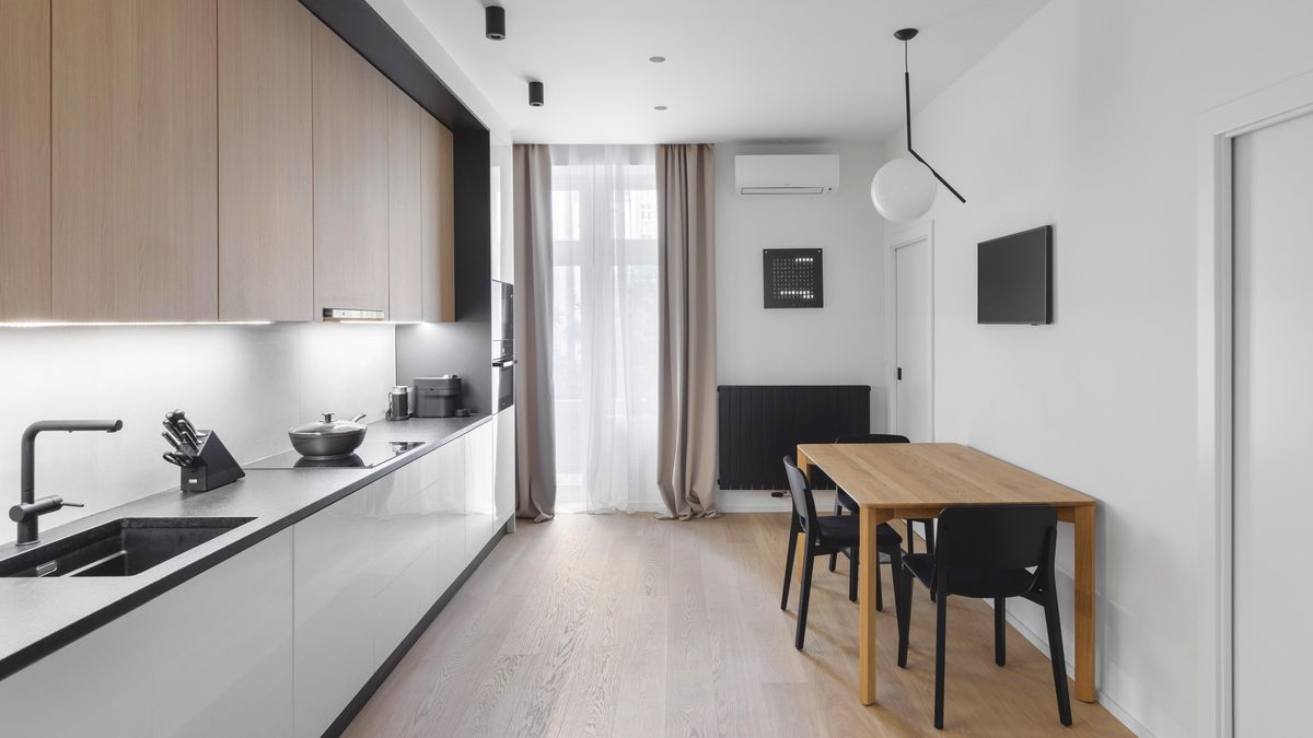 V místnosti je také jídelní dubový stůl doplněný sadou černých dřevěných židlí. Nad stolem je zavěšené designové svítidlo.