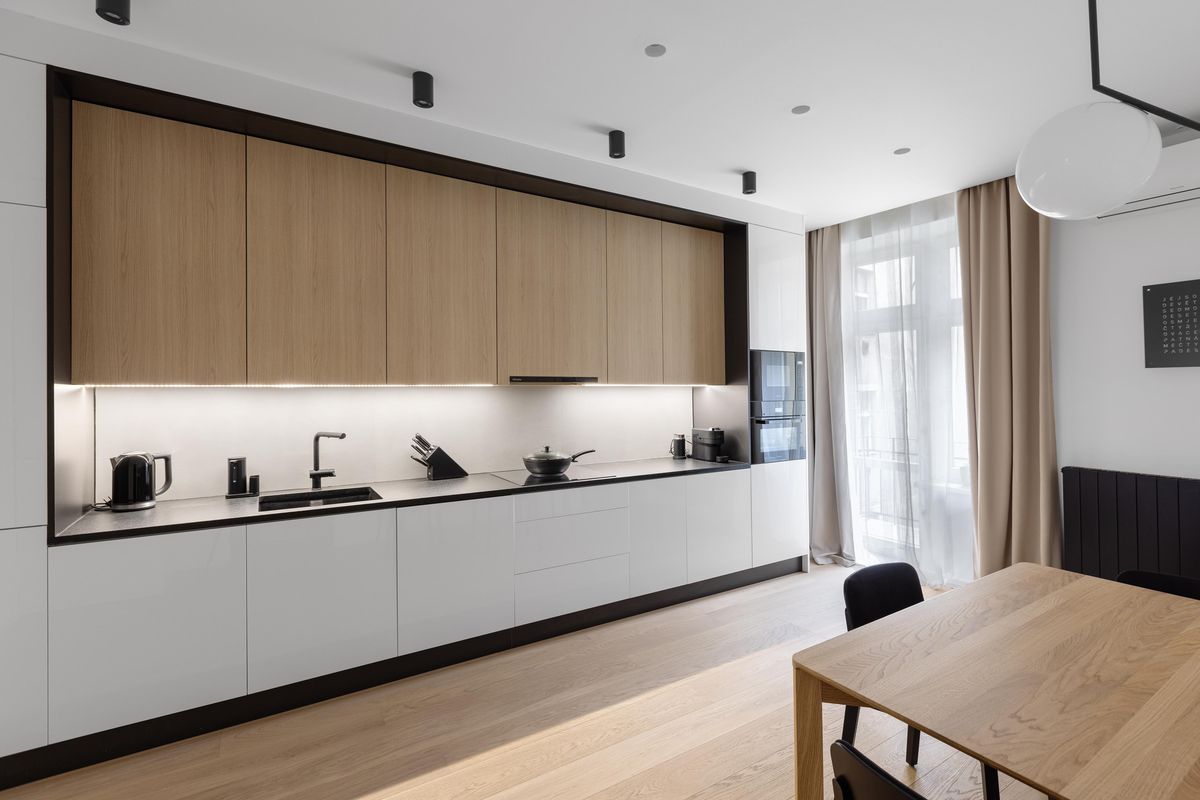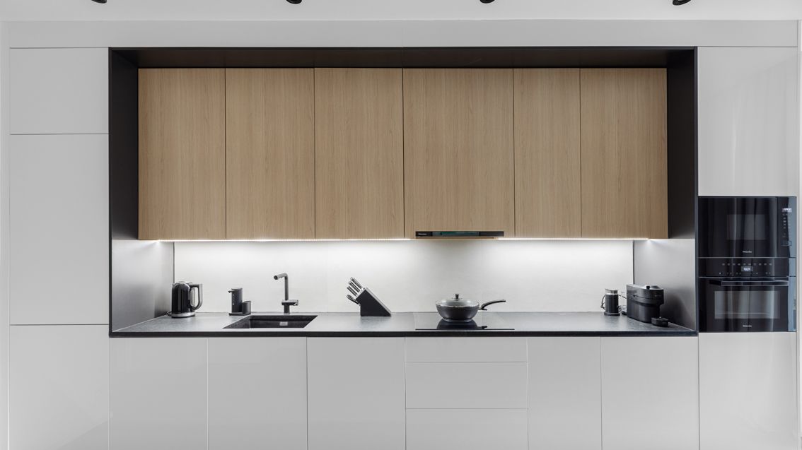 Výrazným prvkem je pracovní deska. Ta je navržena z černé kartáčované žuly a společně s černou linkou kolem vrchních skříněk elegantně podtrhují kontury kuchyně.