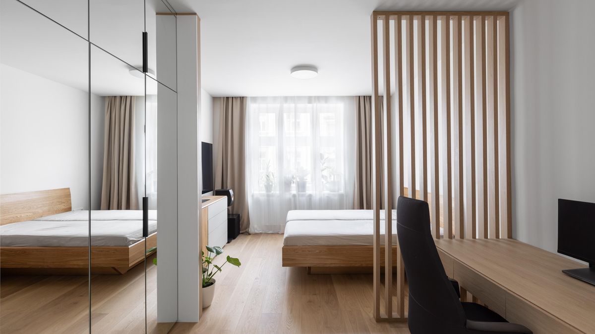 „Od zbytku místnosti jsme „pracovničku“ opticky oddělili podélnými dubovými polopropustnými laťkami. Naproti stolu, rovněž hned u vstupu, je navržena velká zrcadlová šatní skříň,“ popisuje architektka.