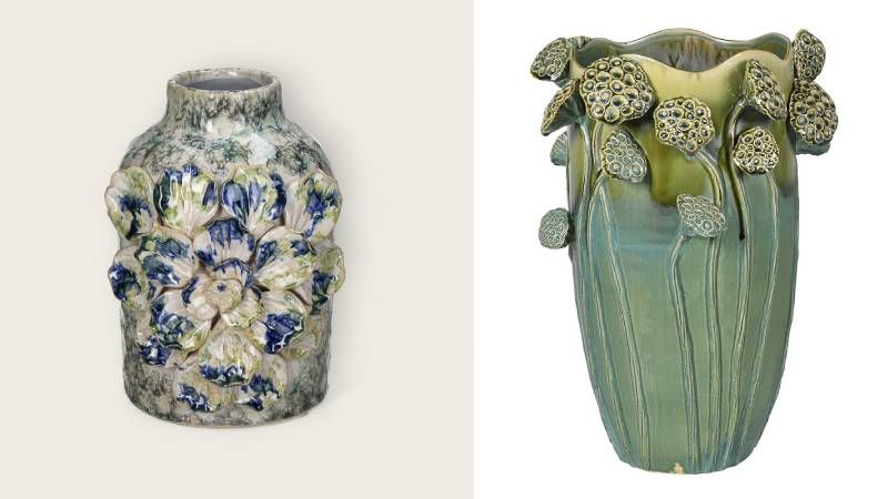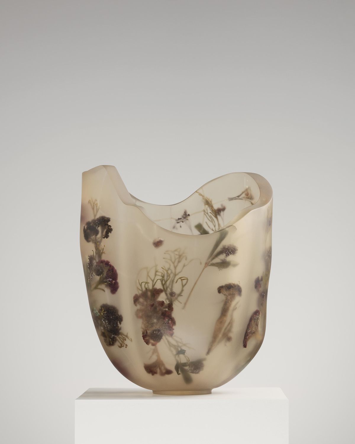 Zajímavé jsou například série sochařských děl z tónované pryskyřice, do jejichž samotného těla jsou květiny zapuštěny. Díky průhlednému materiálu zůstávají dobře viditelné a i tvarově jednoduché vázy tak získávají originální nádech.