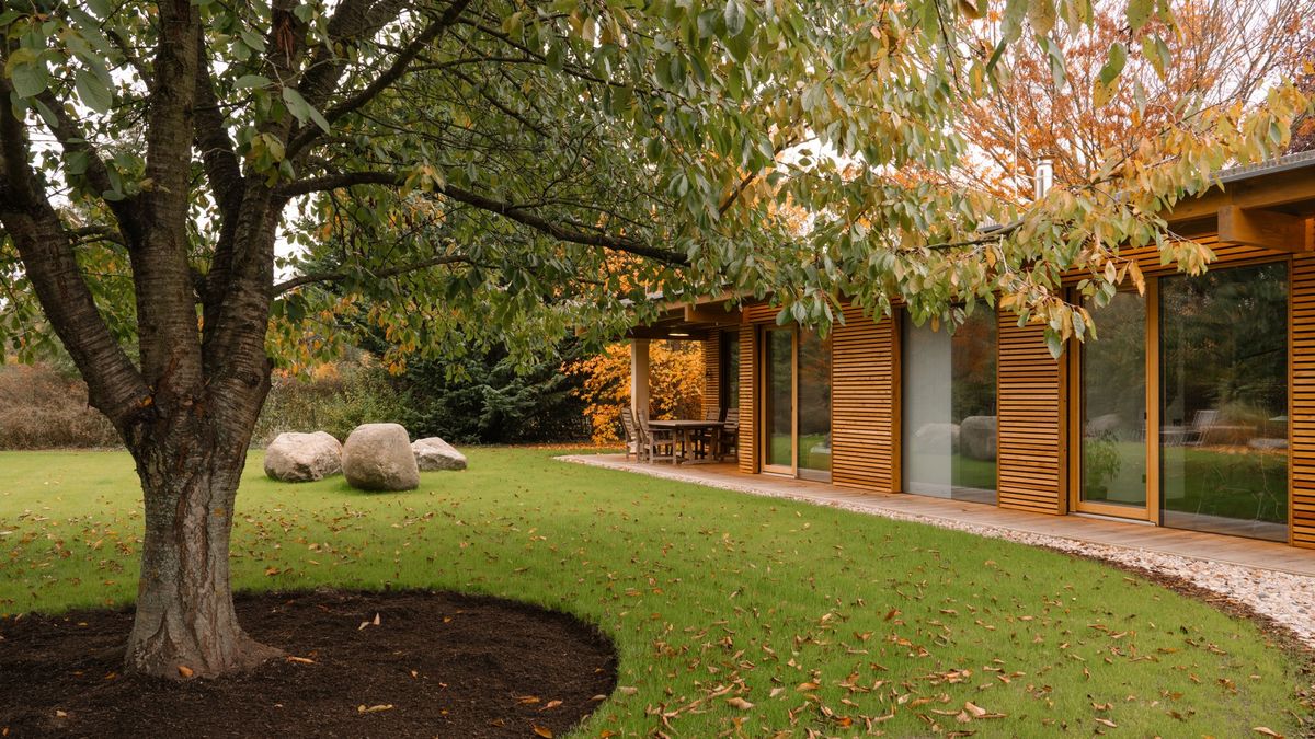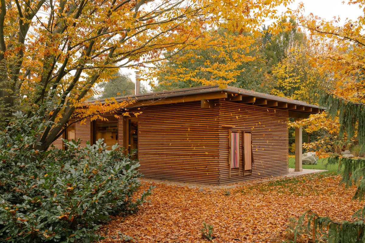 Kompaktní a důmyslně promyšlený vejminek pro své rodiče navrhl architekt Vojtěch Malina. Dům s plochou střechou a dřevěnou fasádou svým umístěním respektuje původní stavbu i pečlivě udržovanou zeleň. Zároveň nenarušuje výhled ze stávajícího rodinného domu a přirozeně také splývá se zahradou, která ho obklopuje.