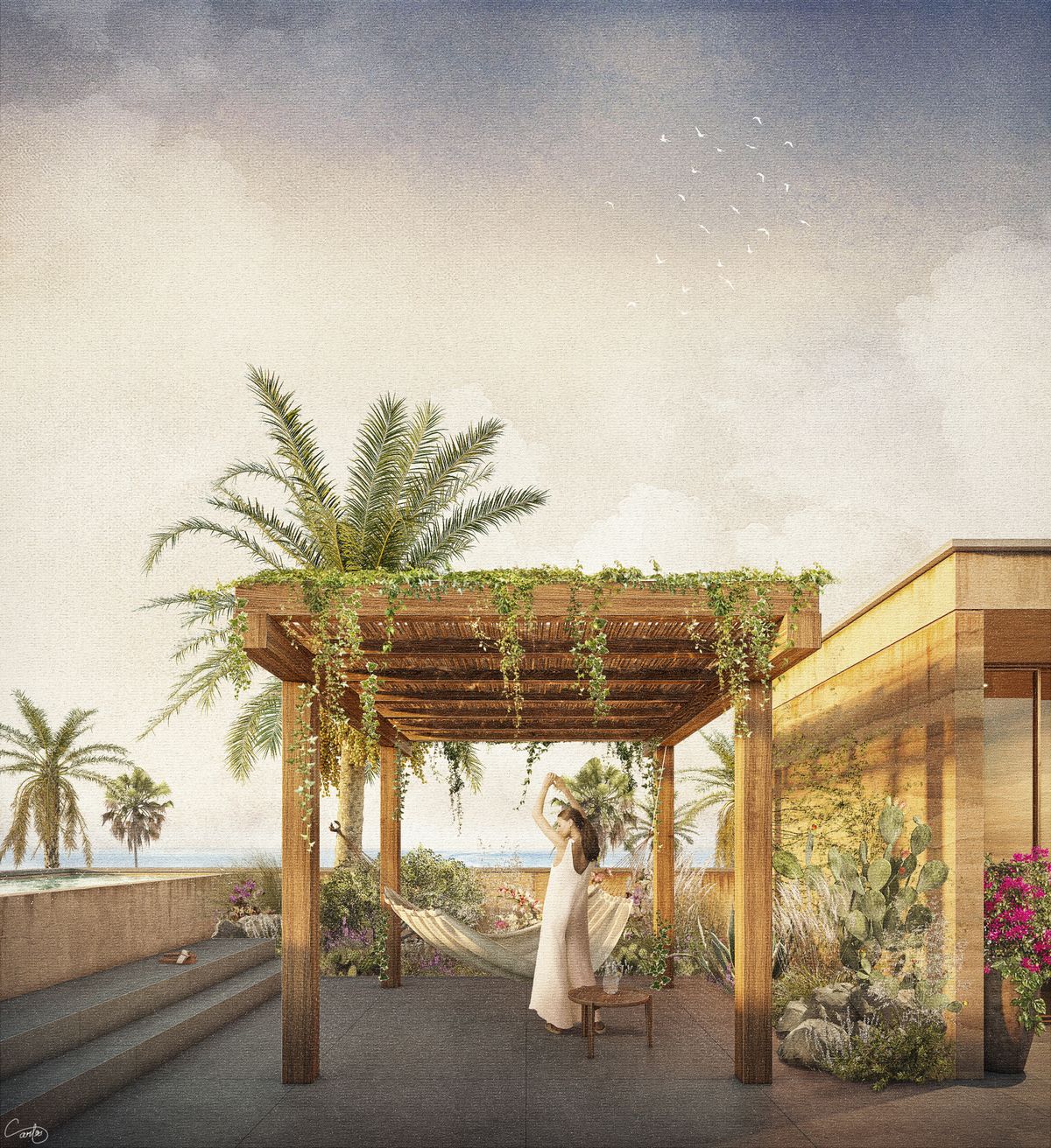 Právě tento dialog krajiny se stal hlavním tématem návrhu. Stavba, jíž navrhl architekt Carlos Eduardo Cruz Ay ze studia Farmatelier, se jím inspirovala: zvýrazňuje horizont, pracuje se světlem, nabízí výhledy a nechává vyniknout proměnlivost přírody – od ostrého denního slunce po jeho pomalé, téměř meditativní západy nad mořem.