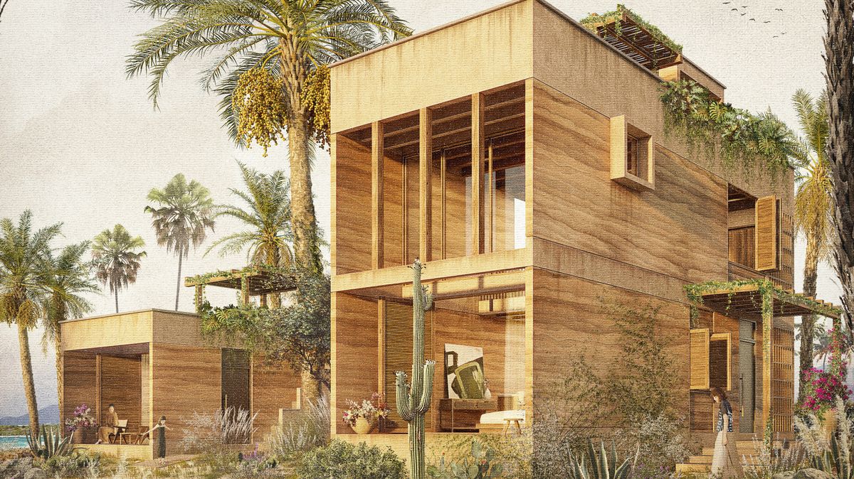 Základním konstrukčním prvkem budou zdi z dusané hlíny, jejichž masivní charakter odkazuje na okolní duny a zároveň přinese vysokou tepelnou stabilitu. V horkém a suchém klimatu nejde o estetickou volbu, ale o funkční nutnost. Hlína zde pracuje – chladí, akumuluje, zklidňuje.