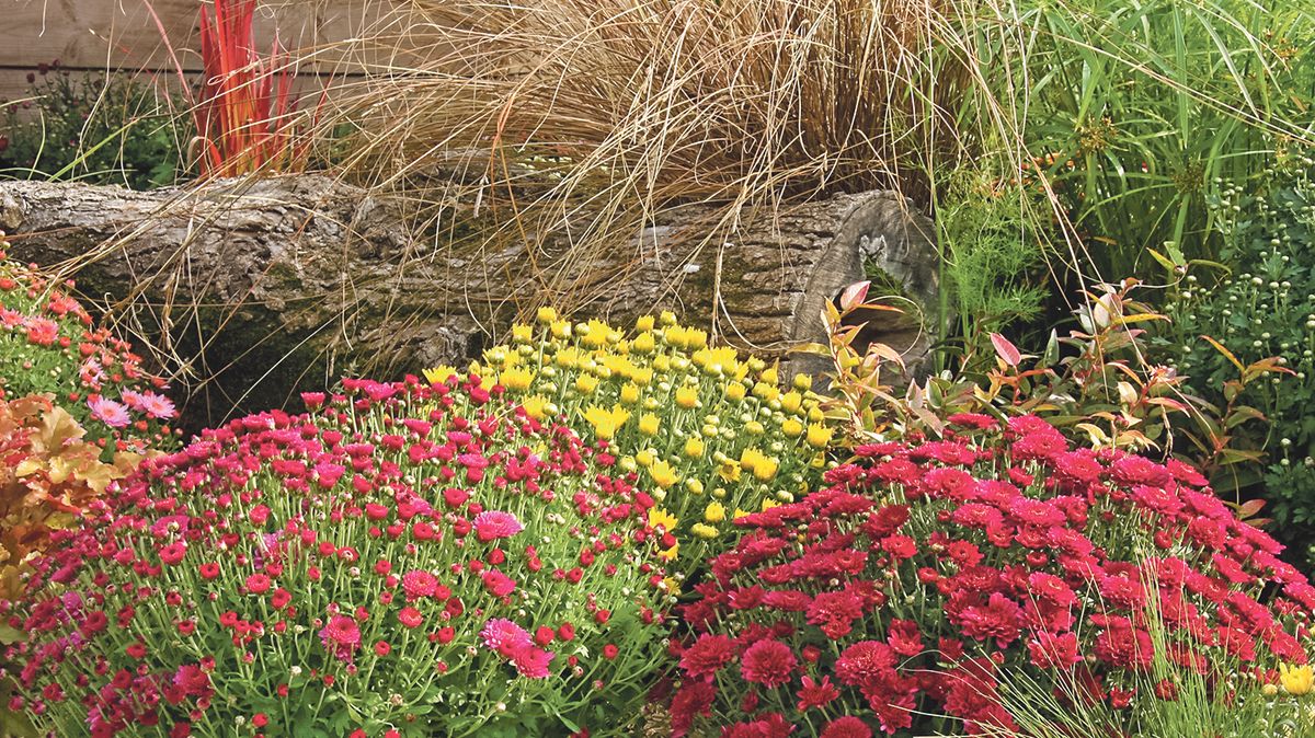 Dlužichy (Heuchera) - listy v odstínech vínové, oranžové nebo zeleno-stříbrné jsou krásným podkladem pro zářivé květy chryzantém.