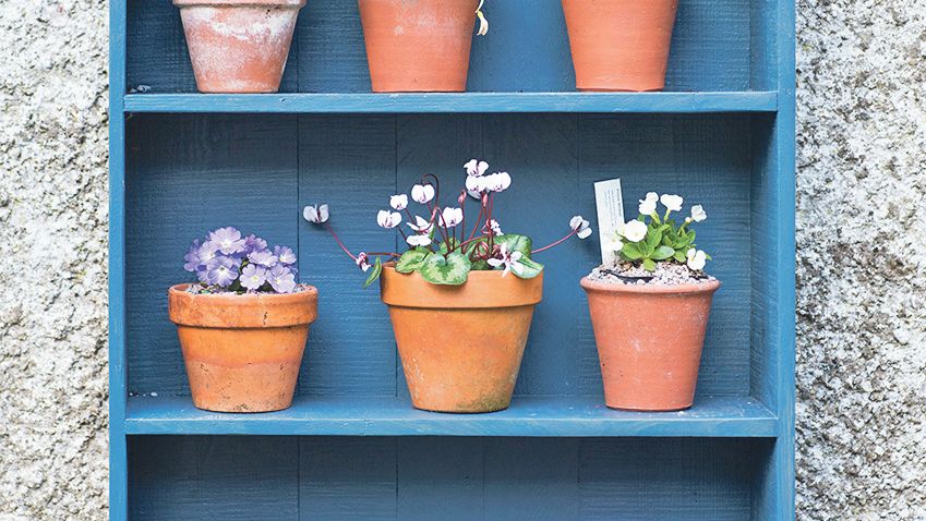 Na nejvyhřátějším flíčku půdy se k drobným jarničkám připojují modřence s hrozny tak snově modrými jako pohádkové safíry. Majitelka se jimi inspirovala a touž barvou přetřela vstupní dveře, lavičku i policový díl, na kterém se skvostně vyjímá sbírka hliněných květináčků s jaterníky, vzácnými primulkami, bramboříky a kosatečky.