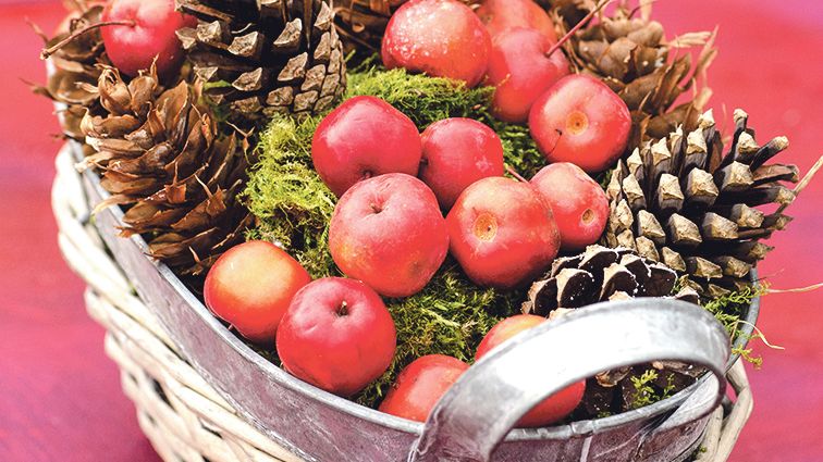 Chybějící barvy na stolku na terase servírují plůdky poskládané jen tak halabala v ošatce s mechem a šiškami. Můžete je také navléknout na drátek a stočit do manžety, která vyšperkuje obyčejný kalíšek na čajovou svíčku.