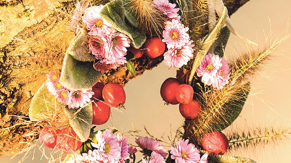 Věneček z ingrediencí nalezených v zahradě, jako jsou vousatá plodenství trav a vlnaté listy čistce, umotáte raz dva. Barvu doplní listopadky a střapce jablíček. Přírodniny upevňujte aranžovacím vláknem ke kruhové šabloně ze silnějšího drátu. Chcete-li věnec pověsit na dveře či plot, opatřete ho nejdřív závěsným poutkem.