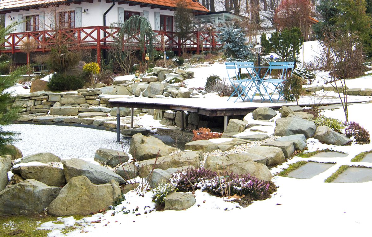 Škrablavé útržky skály i kousky opracované dohladka vystupují ze zimních kulis zřetelněji než kdykoli jindy. Medovými tóny a popelavou šedí čarují nad sněhem přitažlivé scenérie v podobě opěrných zdí, skalek, schodů, dlažby či bordur záhonových i kolem vodních ploch.
