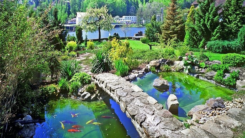 Ale jako malé umělecké dílo může působit i lávka přes jezírko, opět nápad a výroba majitelů. Má totiž jednu zvláštnost, zespodu není beton, ale také kameny, které se krásně odrážejí na vodní hladině. „S oblibou říkávám, že mi to na záda naložila žena a byl jsem tam tak dlouho, než to ztvrdlo. Pochopitelně jsem si udělal dřevěné bednění a kameny se pak vyskládaly,“ usmívá se Dalibor Řihánek.