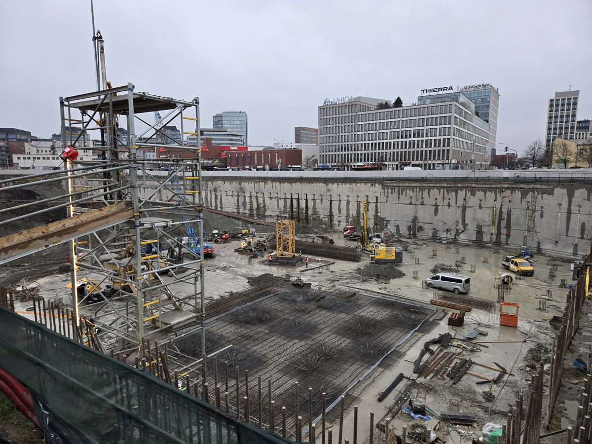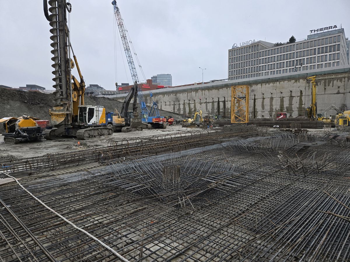 Hotové je zajištění stavební jámy společné pro pět z šesti budov. Hotova je rovněž více než polovina zemních prací. V současné době stavební dělníci provádějí pilotáž a geotermální vrty, které budou zdrojem energie celého projektu. Hotová je i první část základové desky.