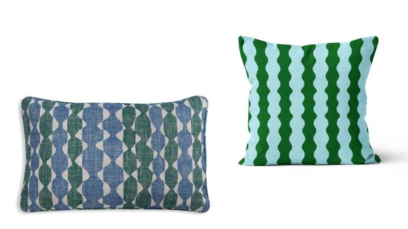 Polštáře v kombinaci zelené a modré s retro vzorem přijdou vhod.