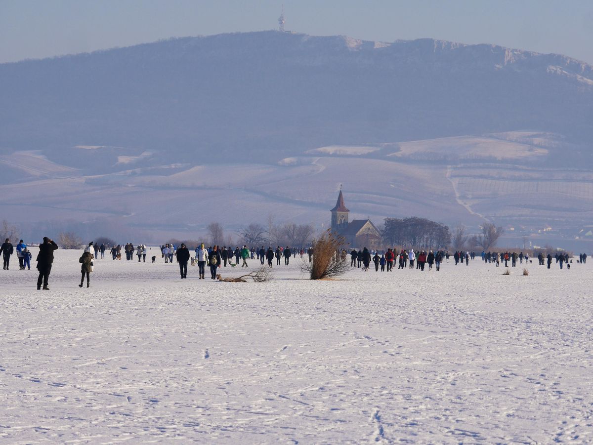 Věstonická nádrž v roce 2017. Lidé se procházejí po ledové ploše až ke kostelu sv. Linharta.