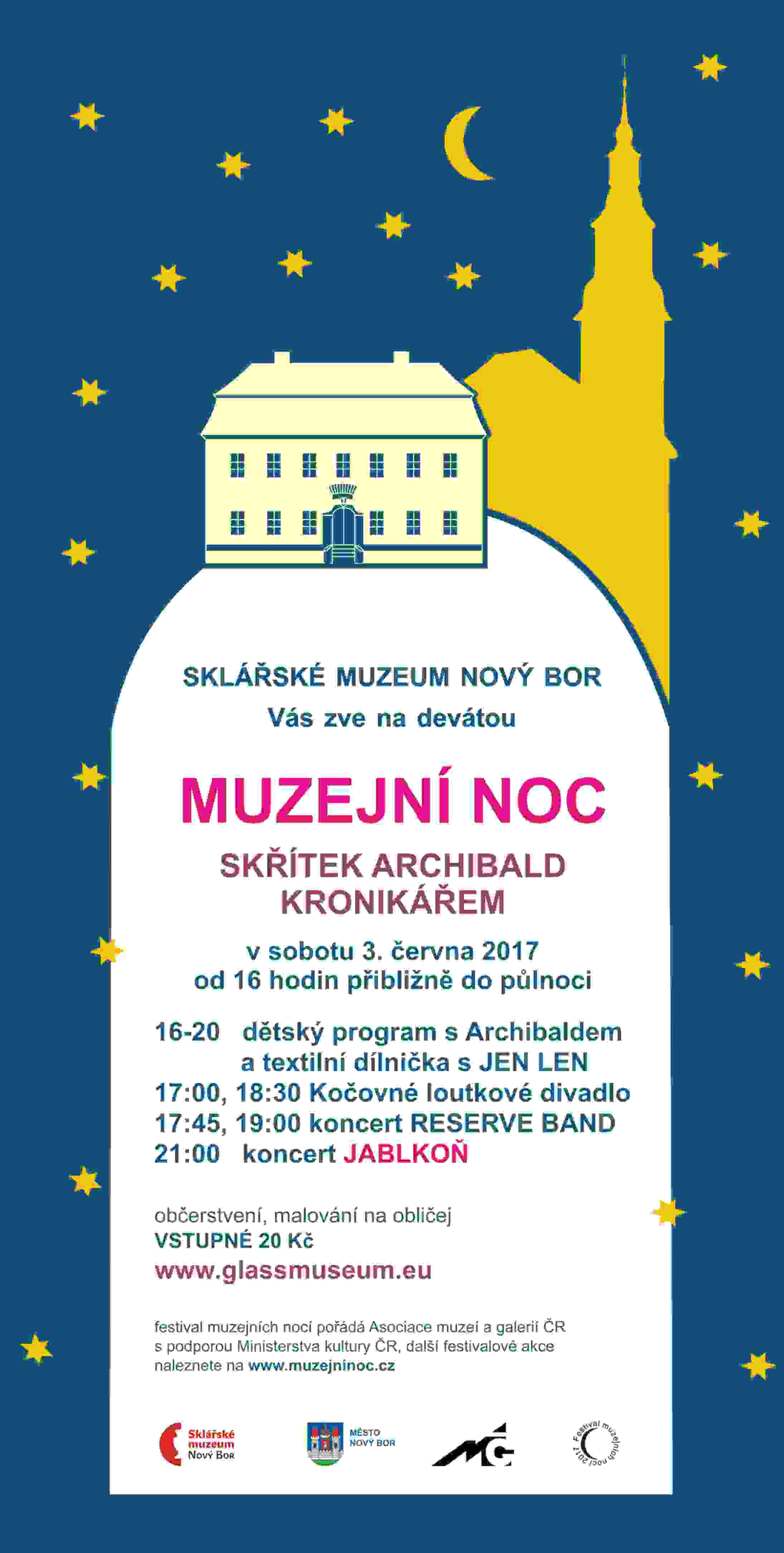 V rámci 9. muzejní noci v Novém Boru mohou návštěvníci zavítat Sklářského muzea, kde čeká program na děti i dospělé. V sobotu se spolu se skřítkem Archibaldem vydáte na dobrodružnou cestu napříč historií města a skrze zábavné úkoly a jejich plněním si vytvoříte vlastní kroniku města. Kočovné divadlo si pro návštěvníky také připravilo dvě inscenace známých pohádek Perníková chaloupka a Čert a Káča. Vstupné je pro všechny 20 korun. Detaily zde.