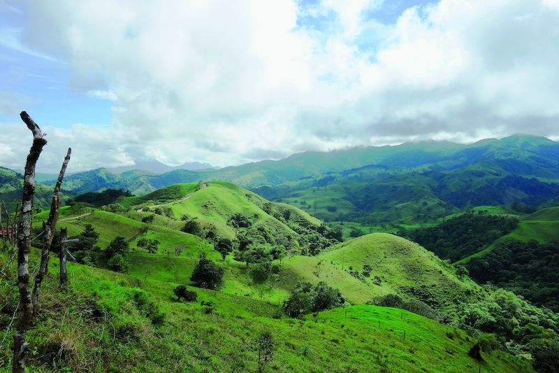 Kopcovitá krajina Kostariky mezi jezerem Arenal a oblastí Monteverde.