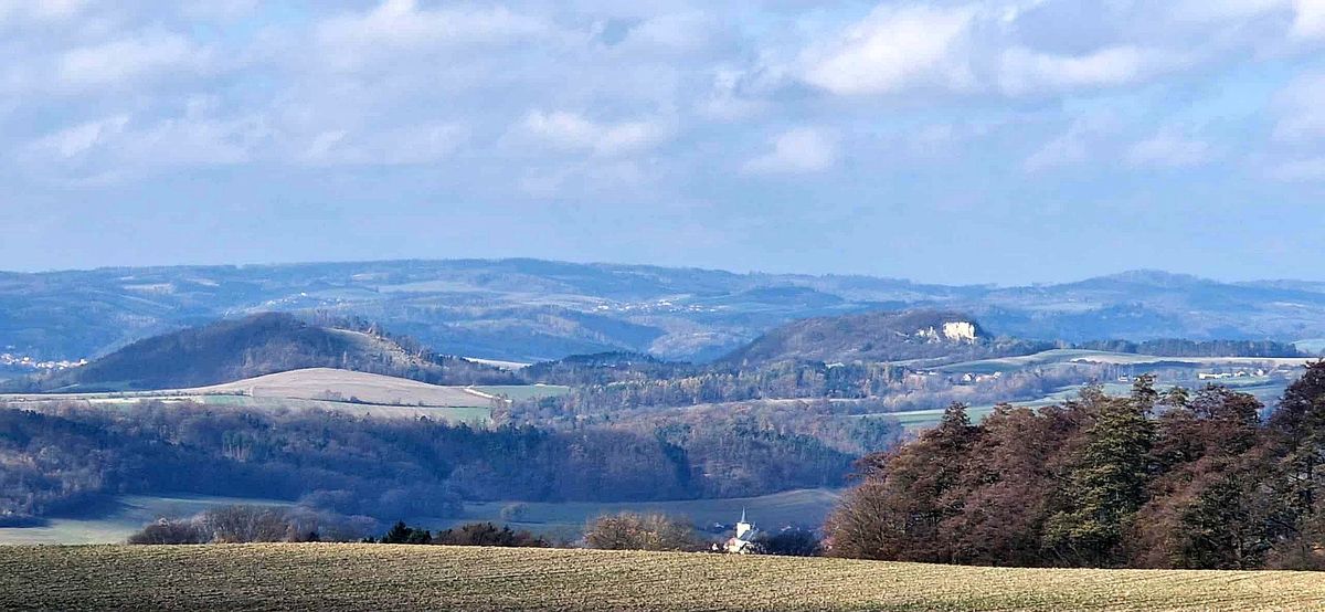 Moravská prsa: vlevo Velký Chlum (zcela zarostlý lesem), vpravo Malý Chlum, na němž je rozhledna.