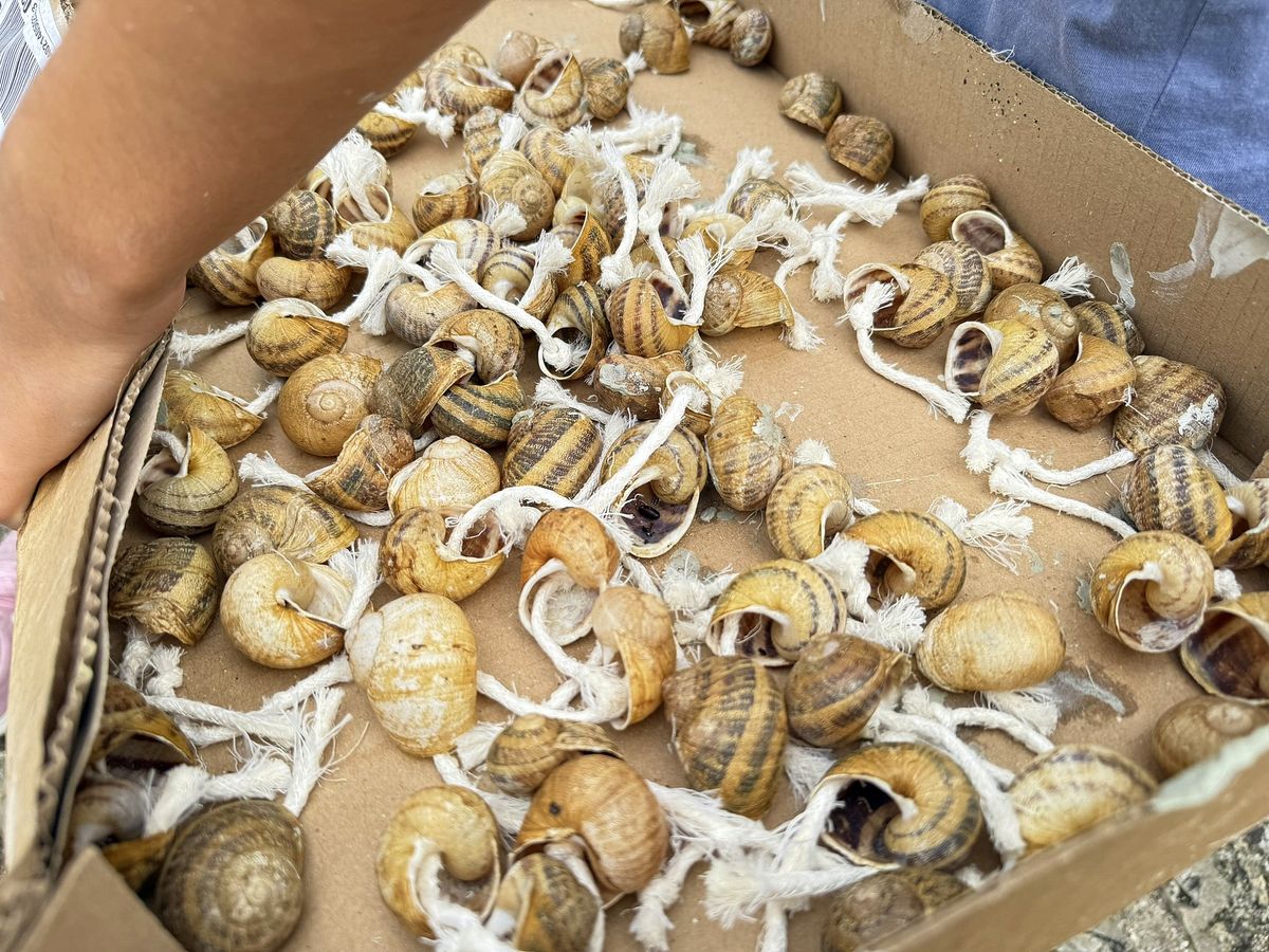 V zamračeném odpoledni sledujeme stovky lidí při práci. Pečlivě očištěné ulity šneků se dříve sbíraly výhradně na polích okolo vesnice, dnes už jsou využívány i skořápky z nedaleké šnečí farmy, která delikatesou zásobuje především Francouze. Ulity ale zůstávají zde. Každý rok je jich totiž potřeba více než 12 tisíc.