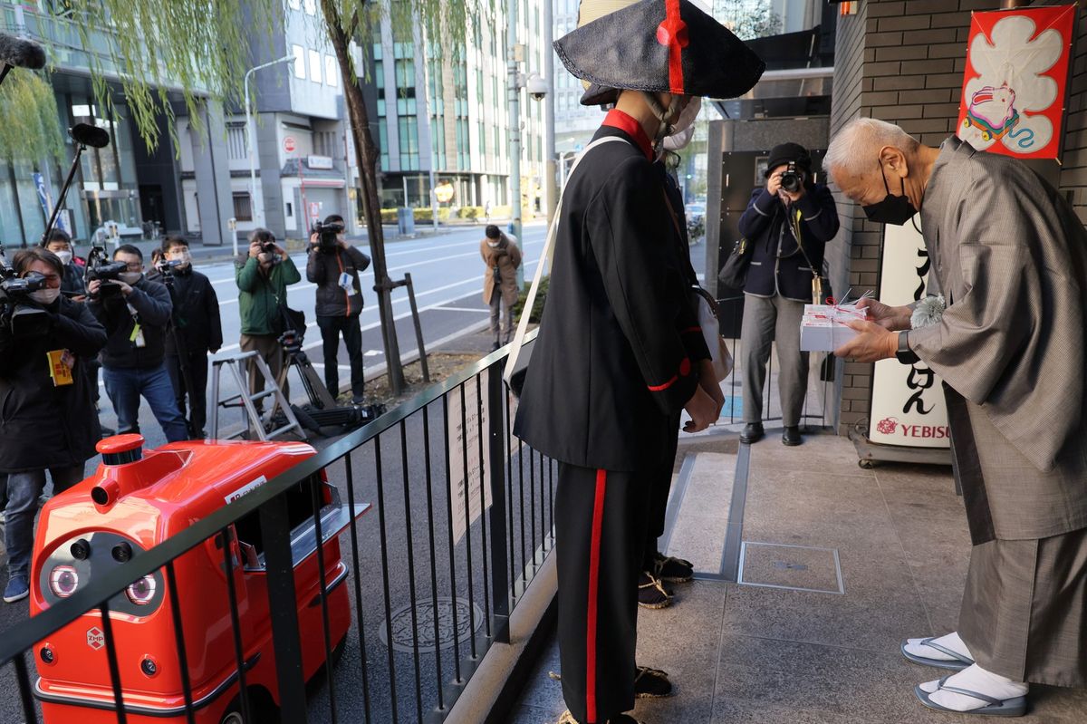 Obyvatel Tokia 1. ledna slavnostně přijímá hromádku nengadžó doručených robotem (vlevo dole).