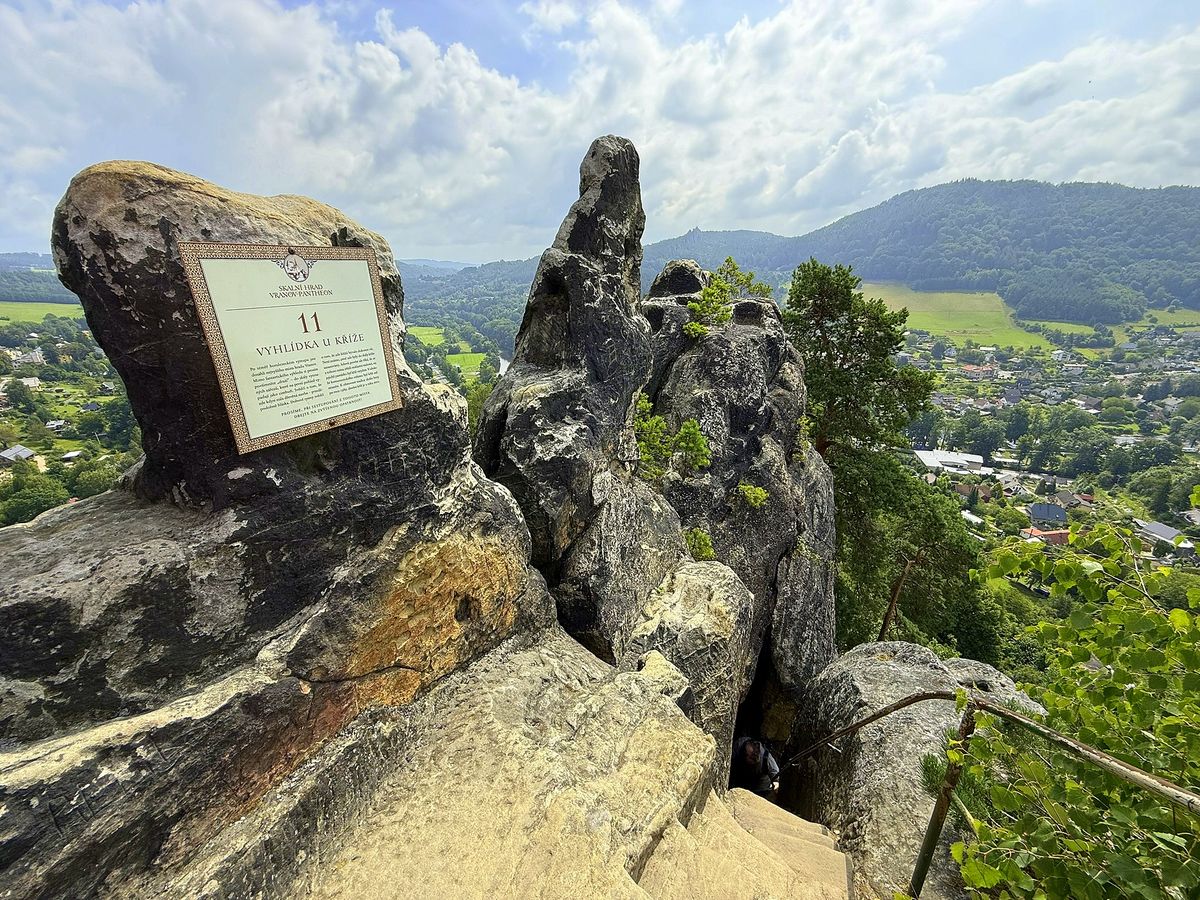 Následuje „pomník Jiřího z Poděbrad“ a cesta k „vyhlídce U kříže“, která vskutku není pro každého. Nahoru to ještě jakž takž jde, ale dolů je třeba se doslova pověsit na zrzavé zábradlí, přičemž většina turistů raději opatrně sestupuje pozadu, schody jdou příliš příkré.