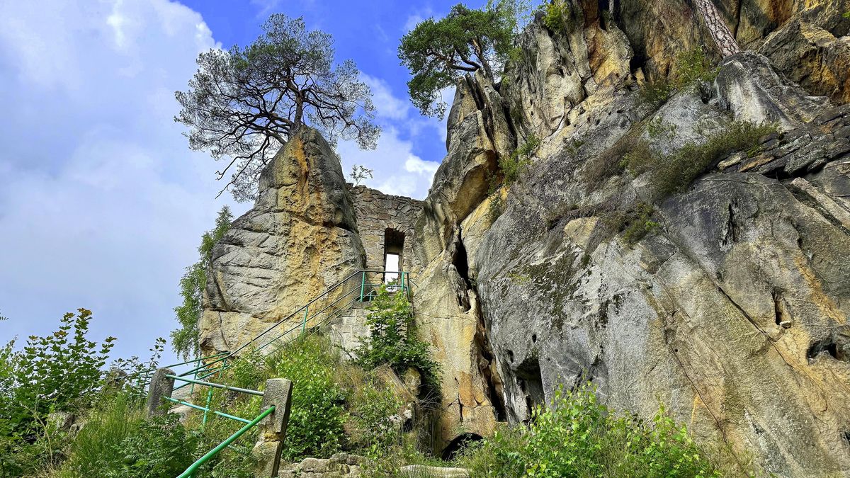 Dnes se ale budeme věnovat kamenné části zříceniny, která za pochmurného podzimního počasí vypadá poměrně strašidelně. A po schodech se k ní stoupá napravo vzhůru. Tyčí se tam skála, z níž vyrůstají pokroucené jehličnany. Že jde o památku, dnes prozrazuje snad jen zelené zábradlí kolem schodů a kus zdiva s dveřním otvorem.