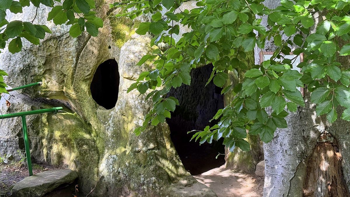 Konečně se blížím k „jeskyni spokojenosti“. Nejzachovalejší skalní místnost hradu sloužila jako sklep na potraviny, tentokrát tedy romantické pojmenování koresponduje s historií. Na její stěně je vytesán nápis: „Býti spokojený v žití umění je velké, však lháti spokojenost namáhání mělké, kdo získá ji, ten v toku štěstí pluje bystrém, kdo zachová ji stále, ten je přímo mistrem.“
