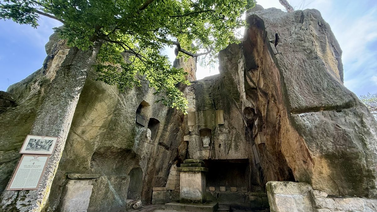Poté přicházím k poničenému „pomníku Karla IV.“ a skalní průrvou klesám k „poustevně se skalním oltářem“. Následuje „smetiště pod hradní kuchyní“, odkud mělo být během archeologického výzkumu v 19. století vyvezeno množství kostí a zubů zvířat. Nechyběly ani hroty šípů a polámané meče. Co se s nalezenými předměty stalo, je ale záhadou.