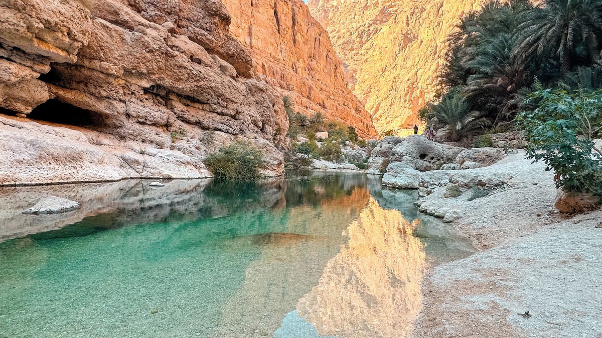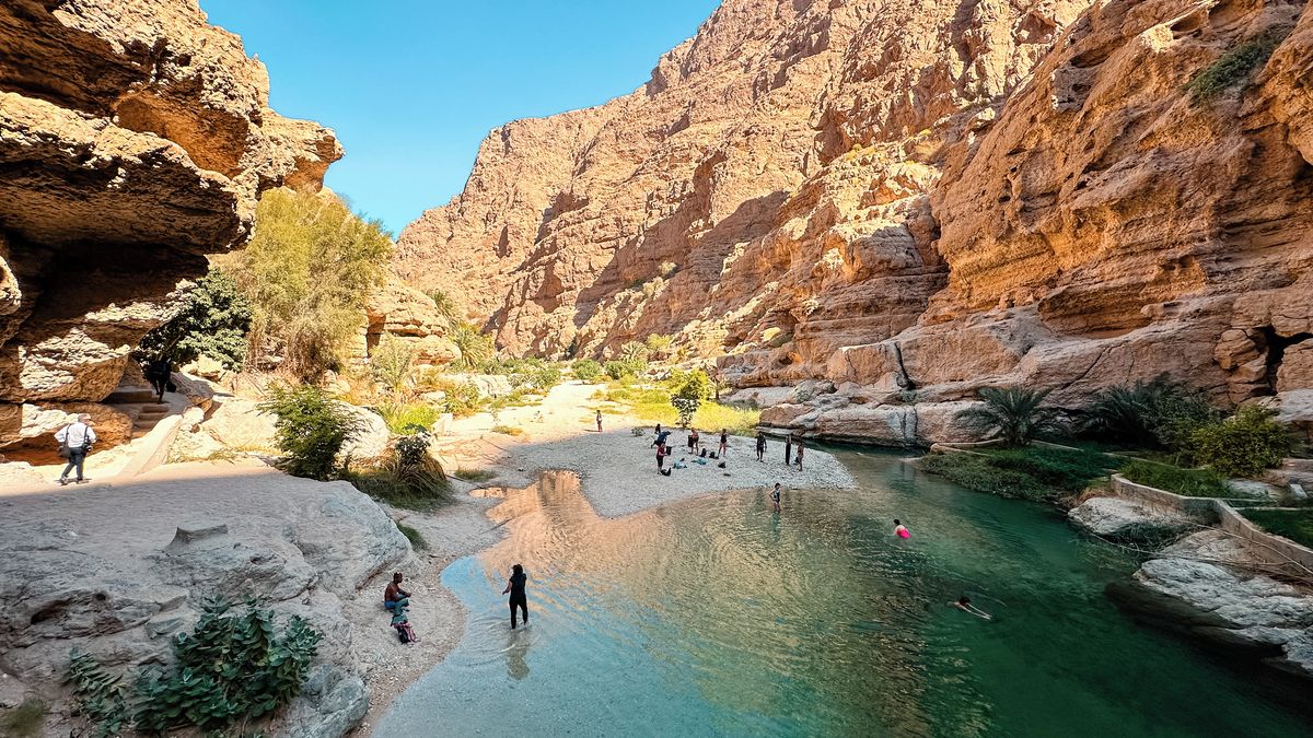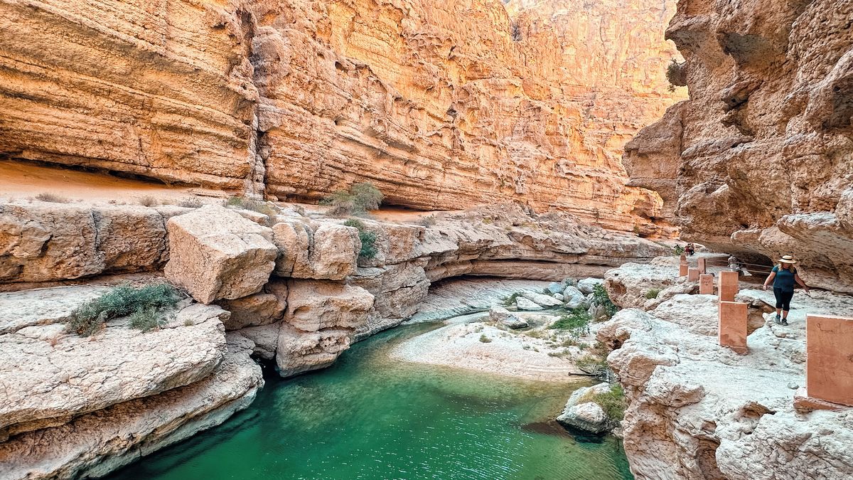 Dlouhá loďka míří na protější břeh. Nedaleko se rýsuje ústí soutěsky a skály se tyčí vysoko do nebe. Začíná naše zhruba tříkilometrové putování do srdce údolí k chladivým jezírkům, která přijdou v parném ománském dni více než vhod. Zdá se to jako krátká cesta, jenže po oblázcích a posléze po vápencových úbočích se nedá chodit zrovna rychle, obzvlášť když je někde potřeba vyhýbat se lidem.