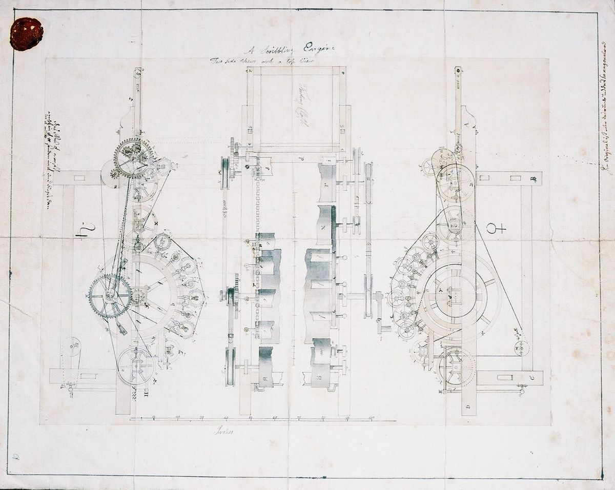 Salmův výkres zachycují tzv. spřádací stroj pro výrobu textilu.