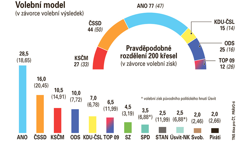Kdyby tento měsíc byly volby, ANO by stejně jako v červenci volilo 28,5 % lidí a podle přepočtu Práva by dosáhlo na 77 mandátů. O dva a půl procentního bodu oslabila vládní podle volebního modelu ČSSD, která by získala 16 procent a 44 poslanců.