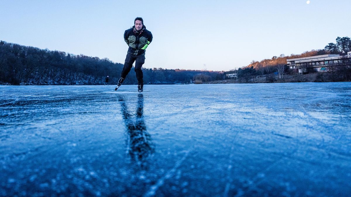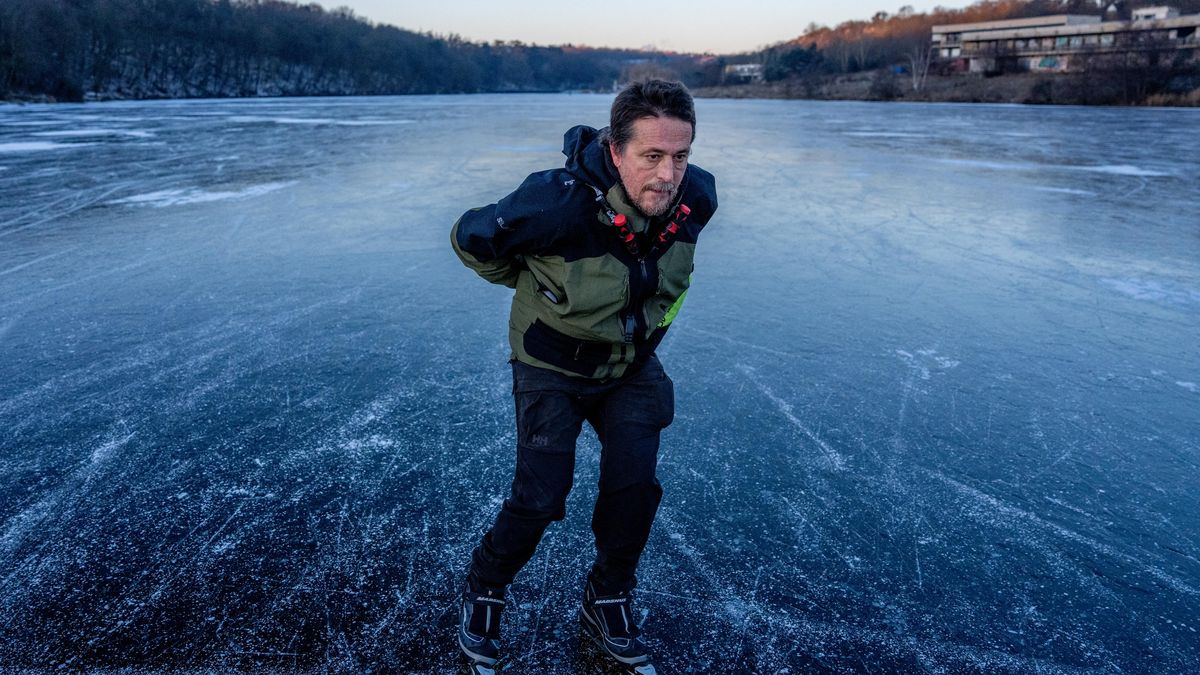 Dálkový bruslař Jan Stodola bruslí na zamrzlé vodní nádrži Džbán v Praze.
